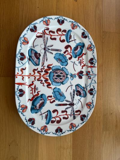 Oval serveringsbricka med blommotiv i blått och rött. Lämplig för servering av maträtter eller som dekorativt inslag. 29x40cm. Oanvänd. Limited edition. Disk o mikrosäker.